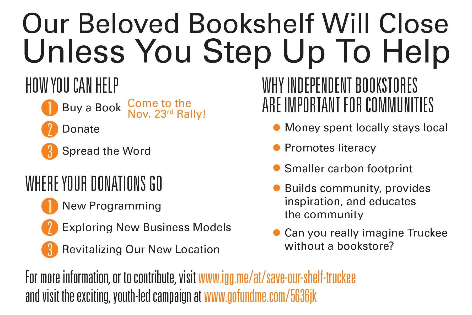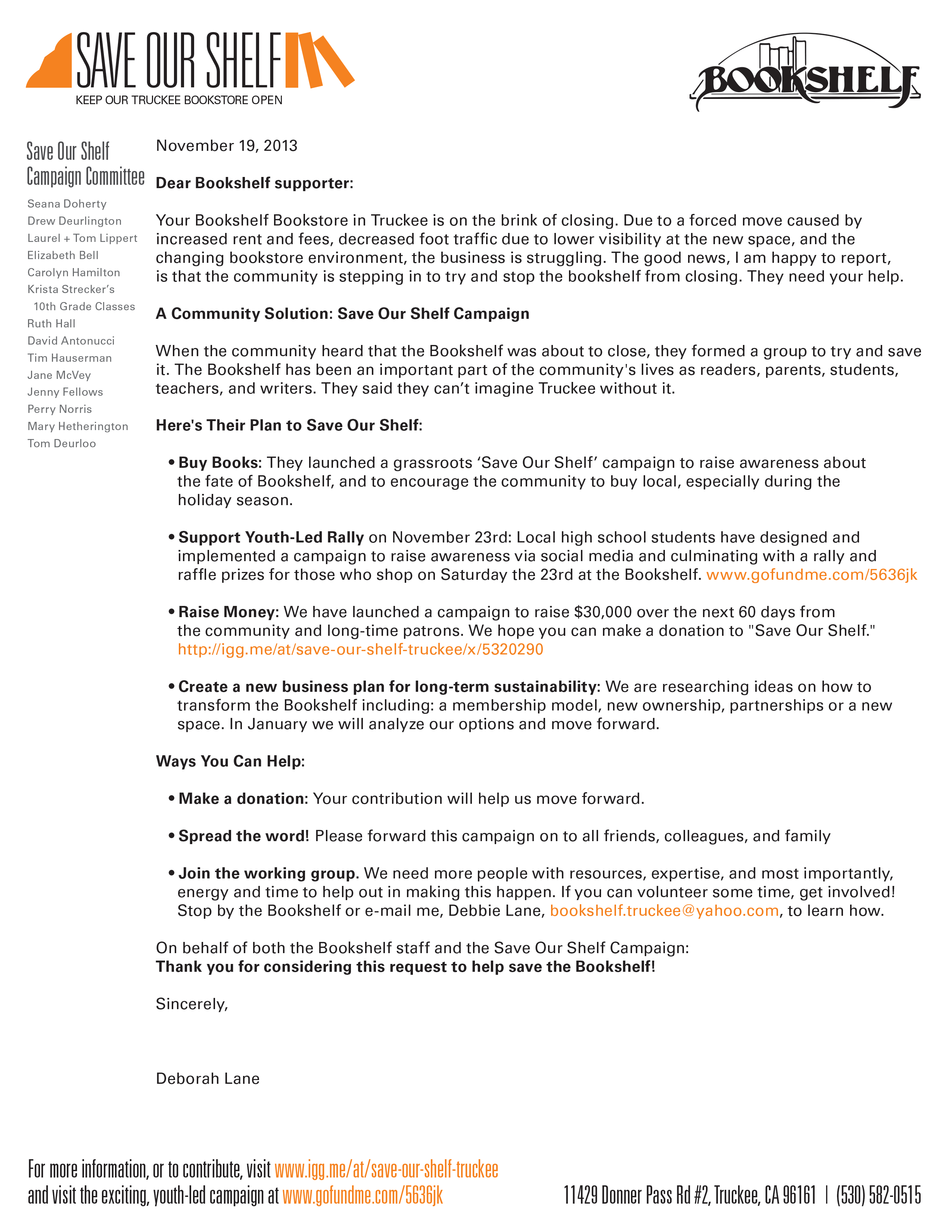 The Save Our Shelf campaign was a grassroots effort to galvanize Truckee residents and visitors to save the last independent bookstore in the region. The Bookshelf has been a Truckee fixture for 20-odd years, though after a move to a new location, many people believed it closed. The campaign increased awareness and helped people reconnect with a store that so many have enjoyed over the years.