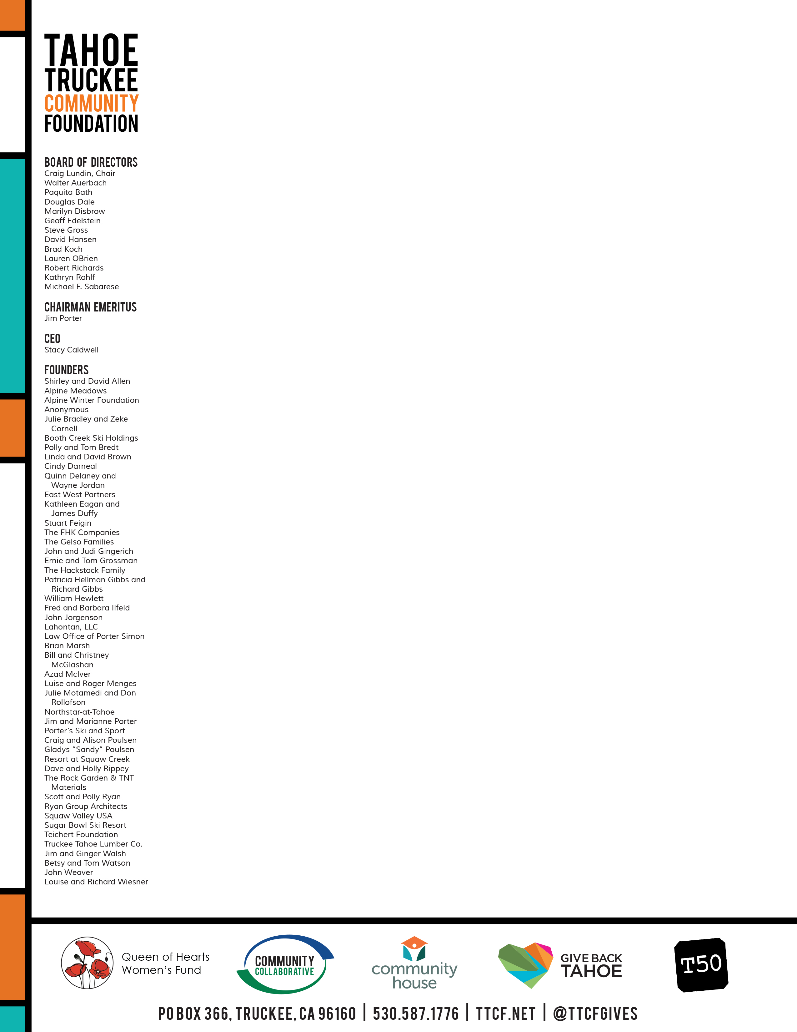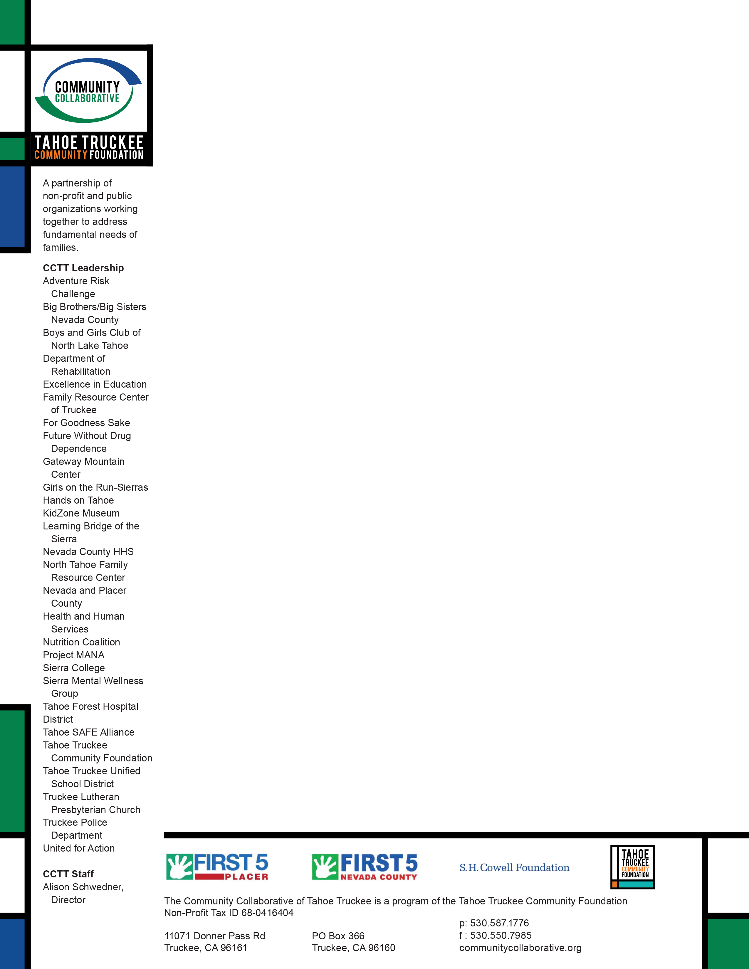 The Community Collaborative of Truckee Tahoe, or CCTT, is a partnership of over 45 nonprofit and public organizations that work to serve the needs of the Tahoe-Truckee region. Though CCTT is older than TTCF, their missions are similar enough that TTCF brought CCTT under its banner. However, the Collaborative still remains semi-autonomous, with its own director, Alison Schwedner.
