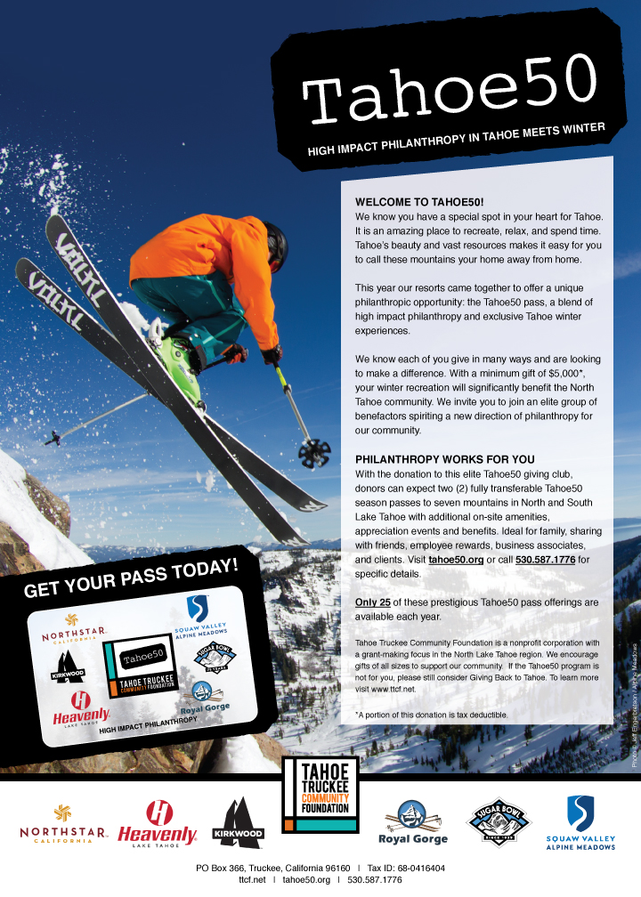 While working with TTCF, I was responsible for the visual creation and development of the Tahoe50 campaign, and its associated collateral, including the brand identity and website. Tahoe50 is an evolving effort to target individuals who are capable of becoming impact donors in the North Tahoe region. With a substantial gift, individuals can receive a number of perks detailed on the website, including a ski pass to seven local resorts.